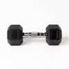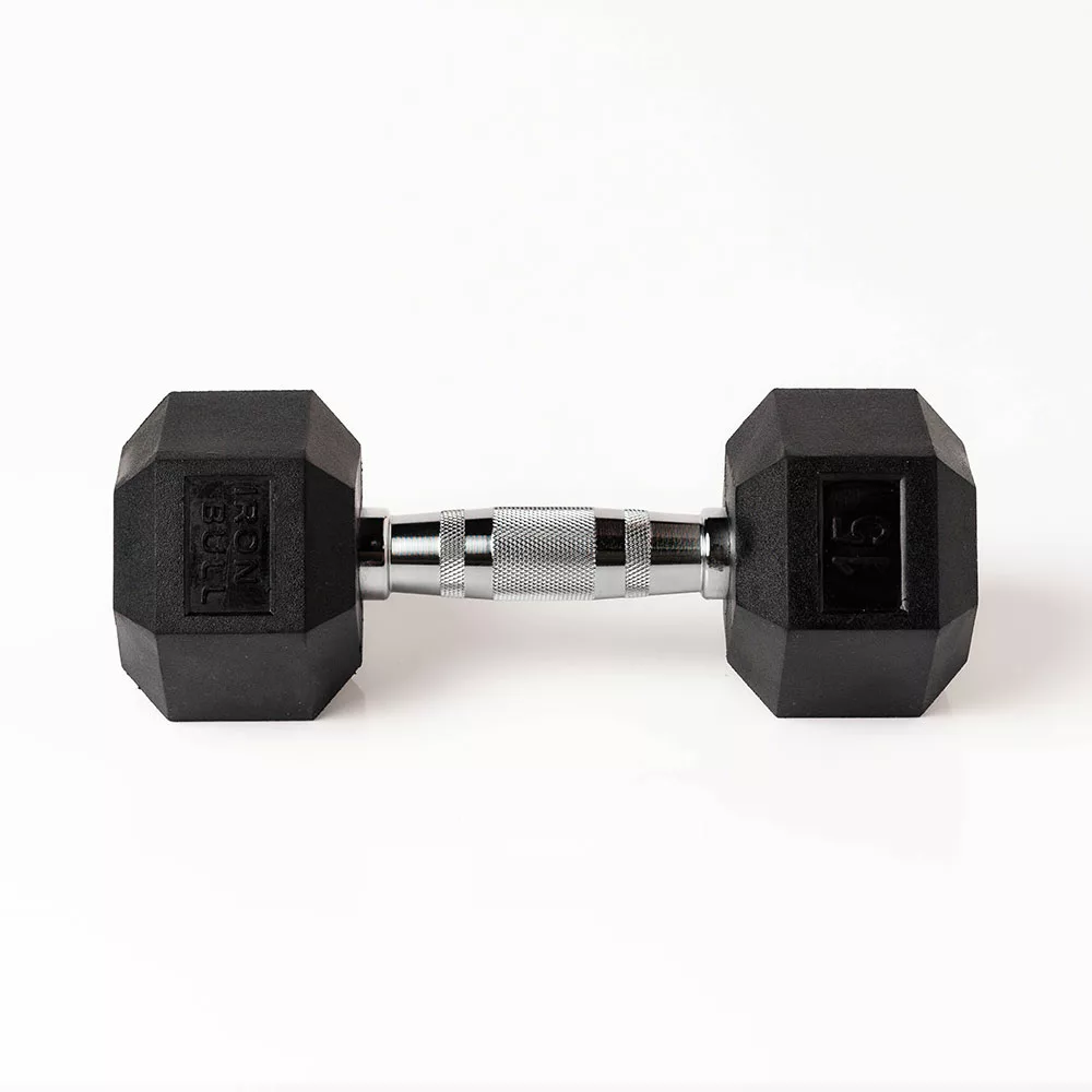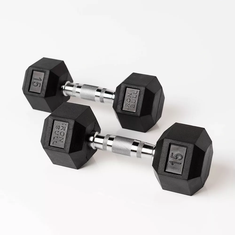 Mancuernas hexagonales de acero recubiertas de goma con mango ribeteado para mejor agarre. Reducen impacto, aumentan durabilidad y son fáciles de almacenar. Peso 15 libras, longitud de agarre 25 mm.