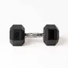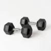 Mancuernas hexagonales de acero recubiertas de goma con mango ribeteado para mejor agarre. Reducen impacto, aumentan durabilidad y son fáciles de almacenar. Peso 30 libras, longitud de agarre 35 mm.